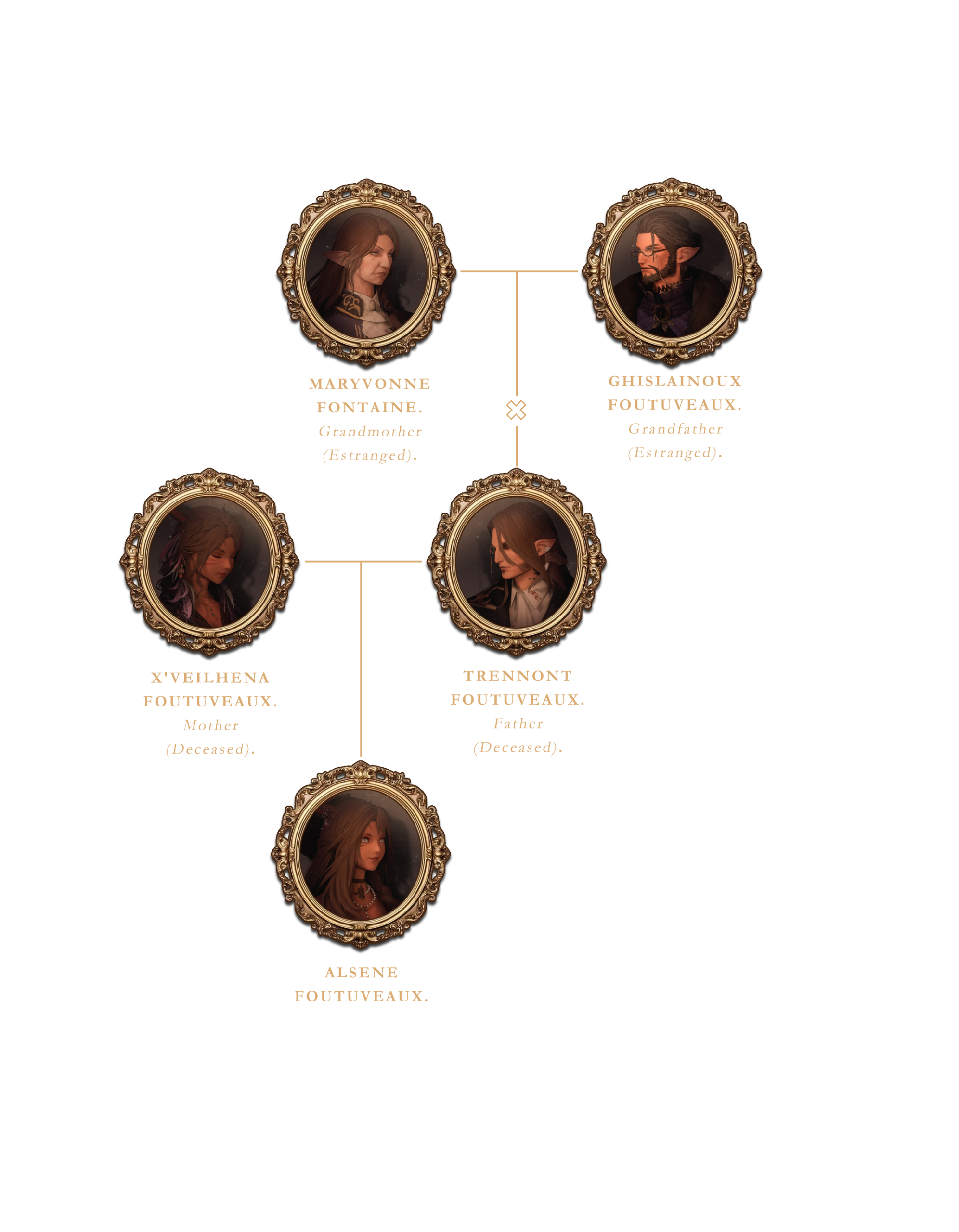 Being a noble, Trennont's path had already been decided for him from the moment of his birth as was par for the course. The life bespoken to him was to succeed his family's joint companies in Ishgard and be bonded to a lady of House Dzemael. Affianced and prosperous, such was the plan--but it was not the plan he wanted. In his travels and research he'd found a path with no predecessor in a woman named X'veilhena.The pair came into contract after her crew tried to raid Trennont's exploration ship. Recognizing the Sharlayan standard and not wanting to make enemies with a larger nation X'veilhena got the captain to release the Sharlayans. However, much to her initial annoyance, in that time Trennont had taken a liking to her. Relentless in his pursuit of her he eventually won over heart and the two became a couple.Unfortunately, due to Trennont's aforementioned path, in the eyes of his parents, their love was but a fleeting stain never to be actualized. However, what they did not account for was their son's level of will. He brought to them the news that his beloved X'veilhena was with child and he'd intended to take her hand to be there for not only her but their unborn child... a move that absolutely could not happen. They gave him an ultimatum: leave X'veilhena and the child, or he would be cut off and estranged from the family.For Trennont, there was only one choice and a rather easy one, he chose X'veilhena. He'd believed that his parents were being harsh for the moment and would come around eventually. It was with this belief that he asked for her hand and eloped. It wasn't until later when he returned to Sharlayan to inform his parents of their bonding that he discovered his family's estate was completely empty. His mother and father had returned to Ishgard without him leaving him and X'veilhena both with nothing.All was not a complete loss however. The pair were both approached by members of the Sharlayan Forum with a proposition that would take care of their momentary woes. In exchange for support in living and board the two of them would act as researchers in the Forum's quest to avert the Final Days. Given that they had a child on the way it wasn't an offer they could turn down. Thus, the two were conscripted and served the Forum, dedicating their lives entirely to the cause that would end their lives later on...