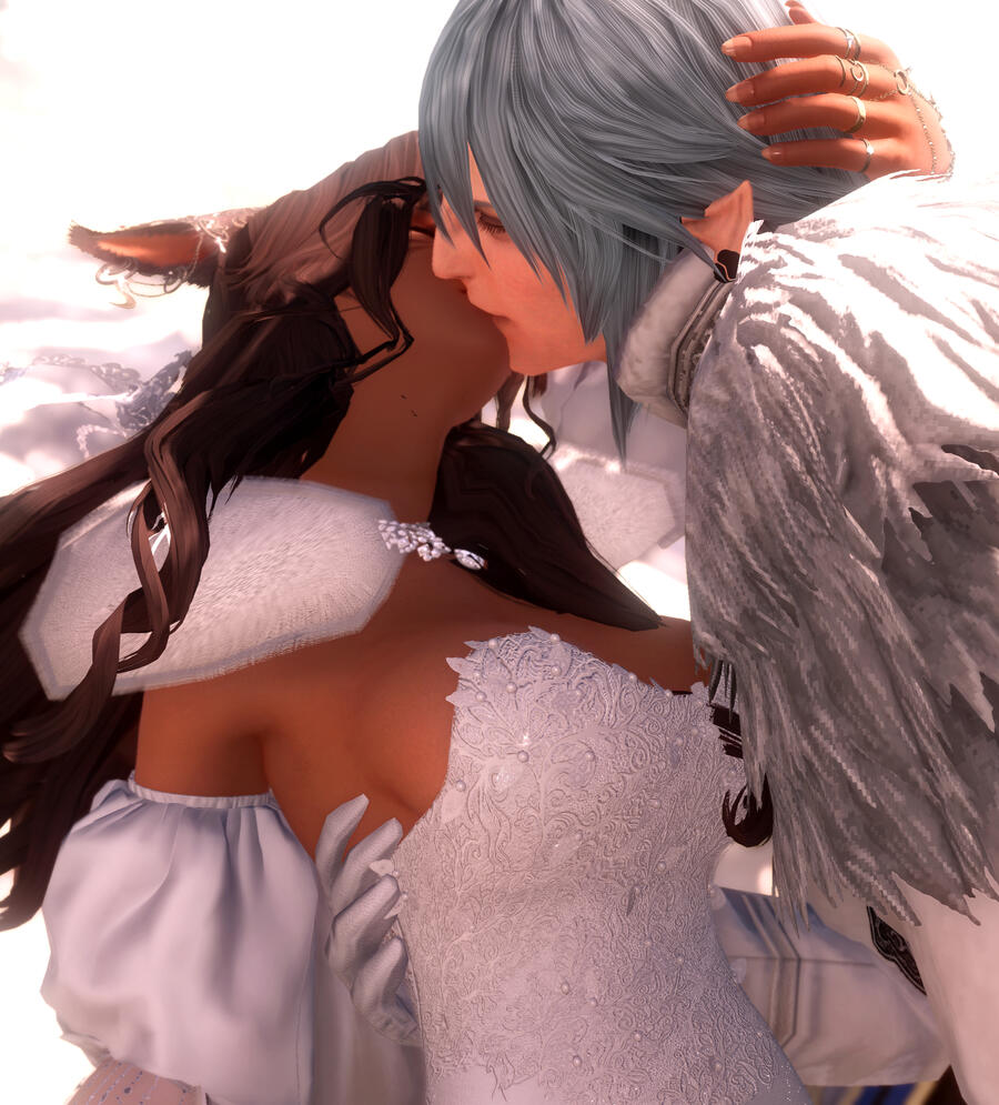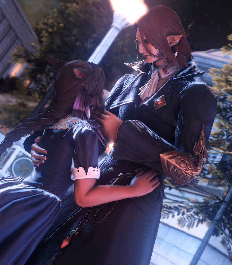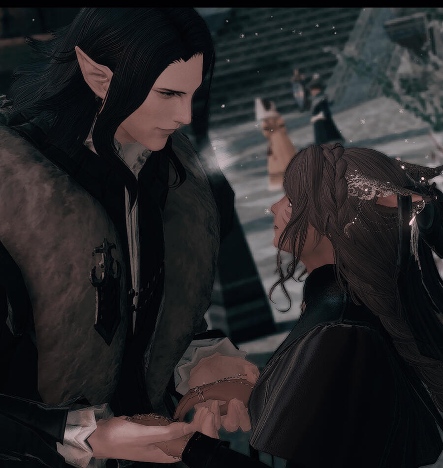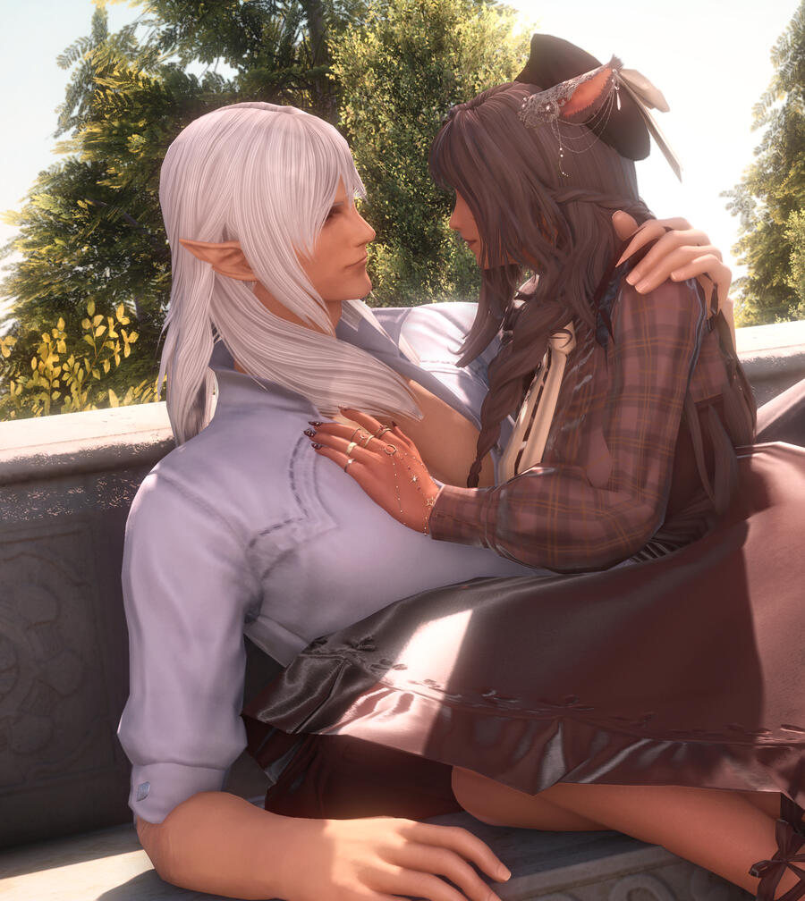 How long had it been that they'd walked this path. Out of sight, but both on to the same end unknown since the beginning. From children feasting upon tomes for bells on end, to near strangers fully bloomed giving greetings in the waking sands. It was nearly comical their fate, and she surmised that not even the elezen's cards could have foretold their outcome. It was no easy barrier to break, especially when they both had one party in mind hindering their union. Though it was with long talks, a brush with death, and some coaxing from Thancred that the two hesitant lovers finally began to see each other. Timid love, gentle as the way they clasped their hands together with their first steps. Slowly over time the humble garden of their love flourished an changed along with themselves.
