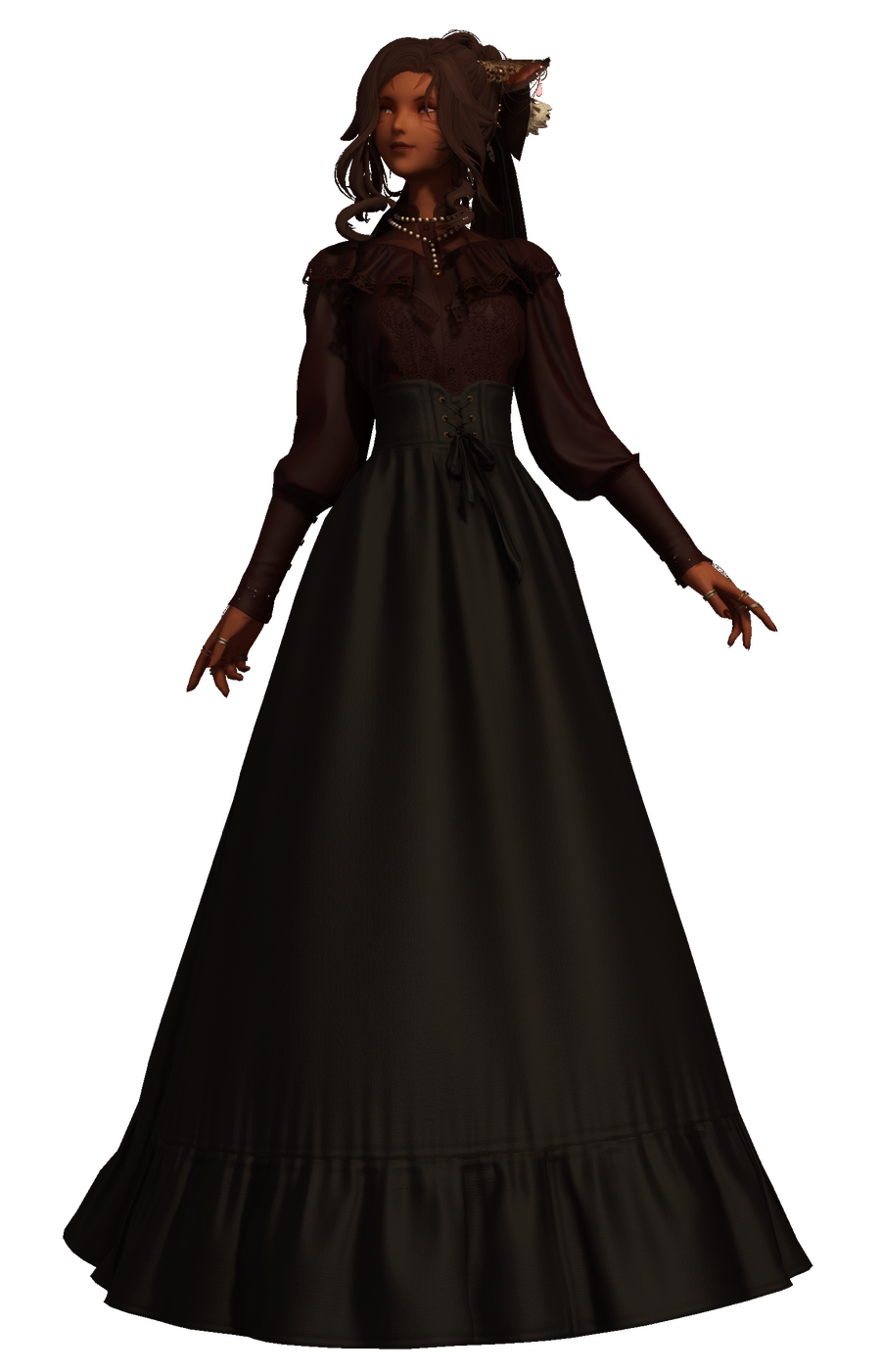 Alsene usually keeps a modest appearance, donning long dresses or skirts with blouses that normally cover her arms and torso. It is rare for her to show a significant amount of skin save for combat. The few times she does choose to let a little more of her self show are: during Ishgardian events, in warmer climates that call for it. Note, she does feel uncomfortable when not covered. Aside from that, she will often if not always wear a bow in her hair, and celestial motif accessories on her hands and nails. A permanent piece on her is her pearl heart locket.